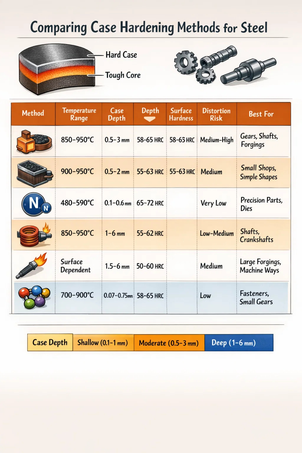 Karkaistu ulkokerros - nimeltään "kotelo" - vaihtelee tyypillisesti 0,1 mm - yli 3 mm syvyys , riippuen käytetystä menetelmästä ja valotusajasta. Ydin pysyy suhteellisen pehmeänä, yleensä välillä 20–40 HRC, vaikka kotelo voi yltää 58–65 HRC hyvin kontrolloiduissa prosesseissa. Tämä kaksivyöhykerakenne ei ole saavutettavissa pelkällä läpikarkaisulla, joten kotelokarkaisu on selkeä ja erittäin käytännöllinen tekniikka teräksen takomisessa ja valmistuksessa.