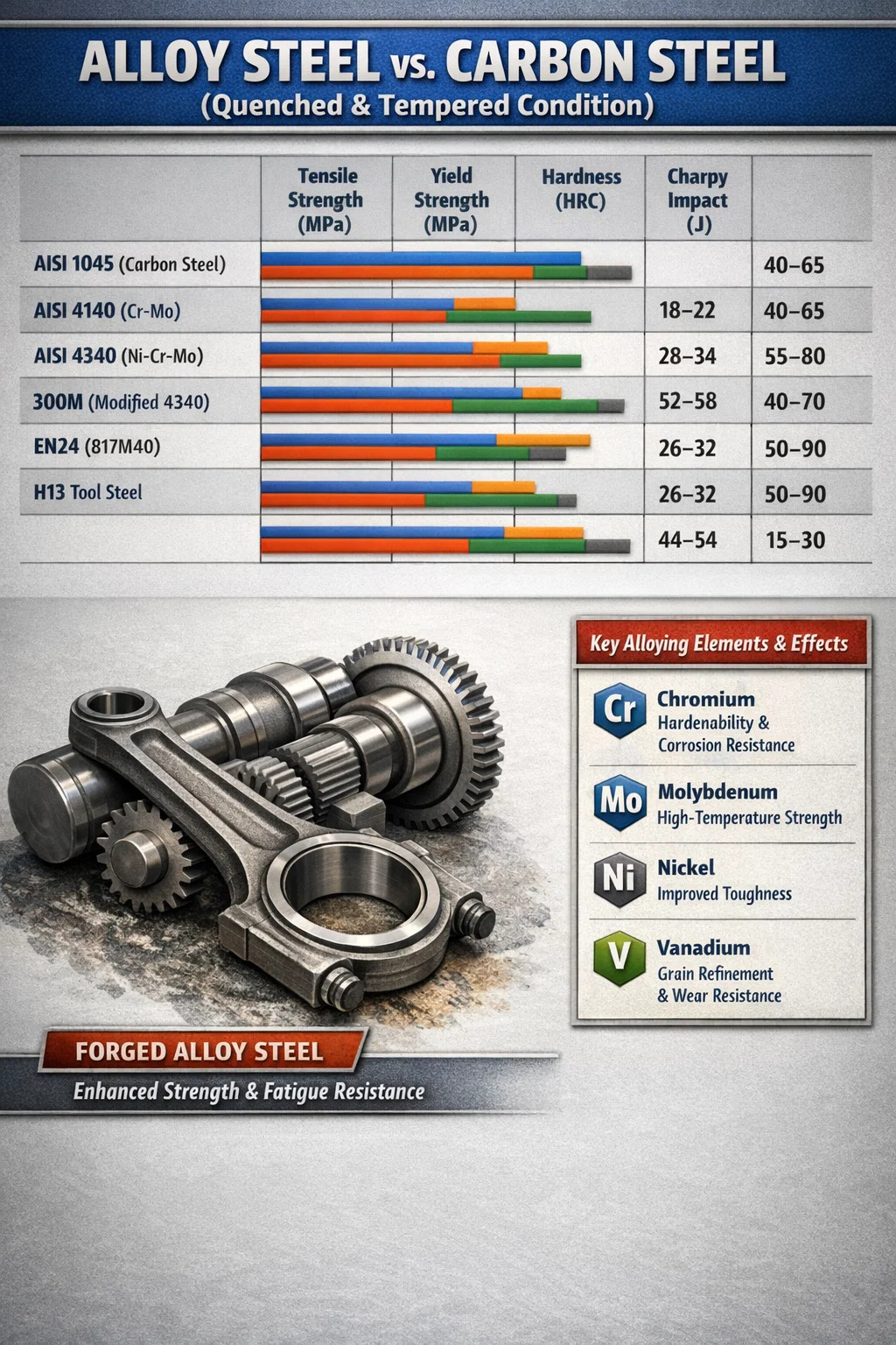 | AISI 4340 (Ni-Cr-Mo, Q&T) | 1100-1450 | 980–1380 | 35–44 | 40–70 |