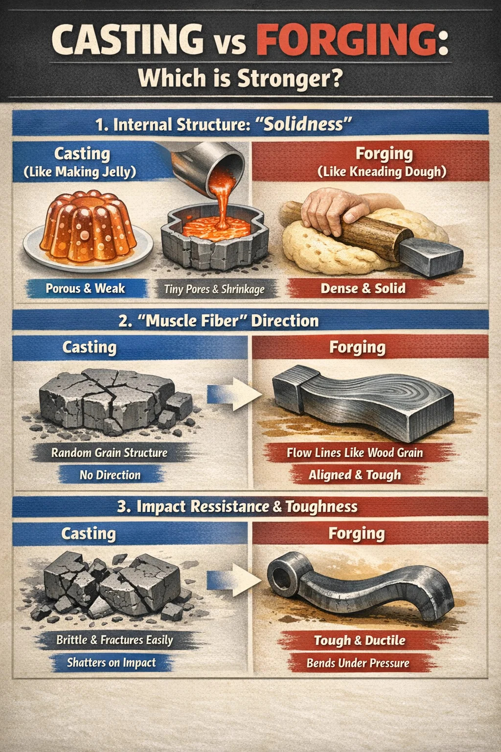 Jos vertaamme metallia elintarvikkeiden ainesosiin, valu on kuin "hyytelön tekemistä". teräksen taonta on kuin "taikinan vaivaamista". Vaikka molemmat voivat luoda halutun muodon, sisäinen tiheys ja iskunkestävyys ovat täysin erilaisia.