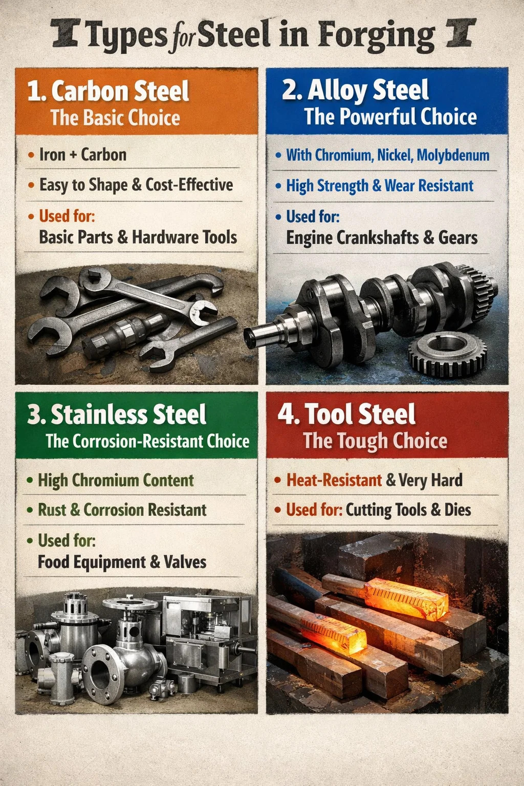 Varsinaisessa teollisessa tuotannossa kaikki teräs ei sovellu "lämmitykseen ja vasaraan". Varmistaaksesi, että tuloksena olevat osat ovat sekä vahvoja että kestäviä, teräksen taonta käyttää tyypillisesti seuraavia valtavirran terästyyppejä sovelluksesta riippuen: